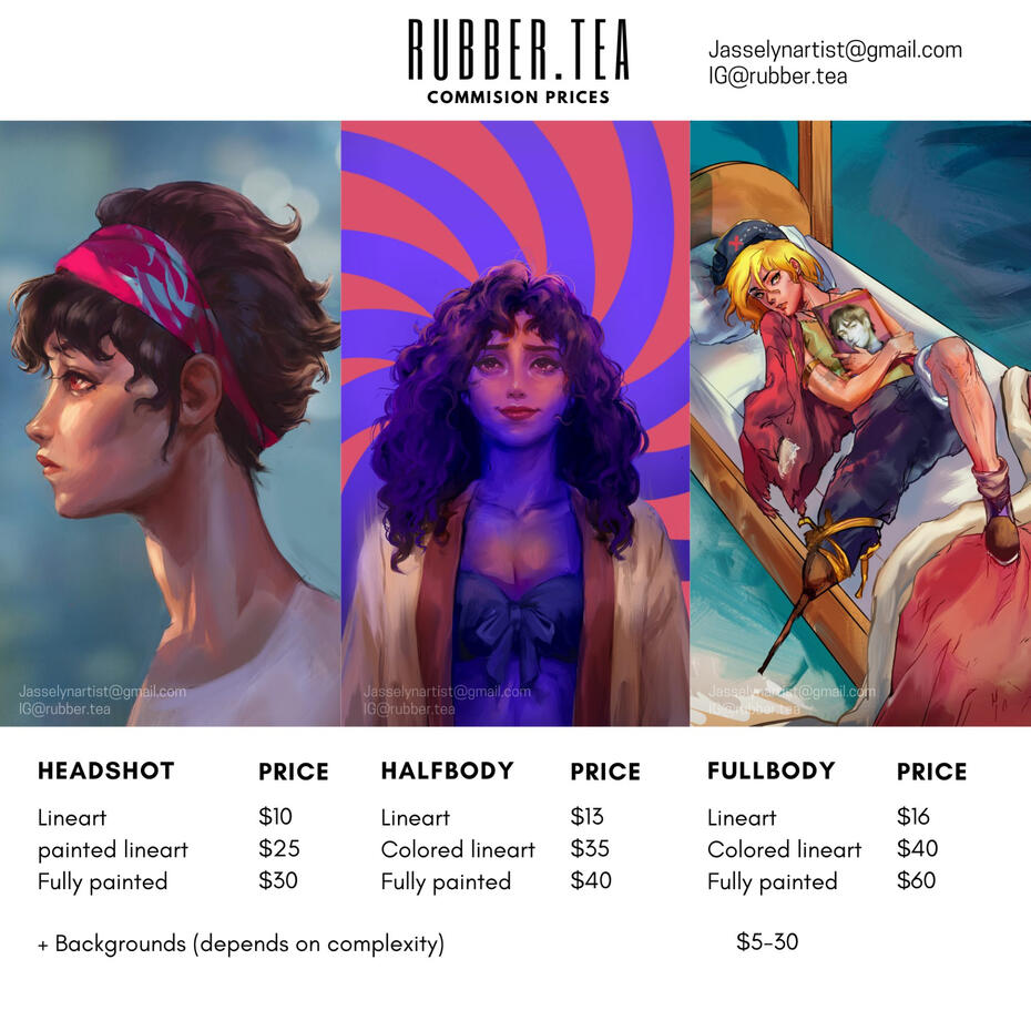 - payment for commissions are split 50/50 (50% upfront, 50% after the work is finished).